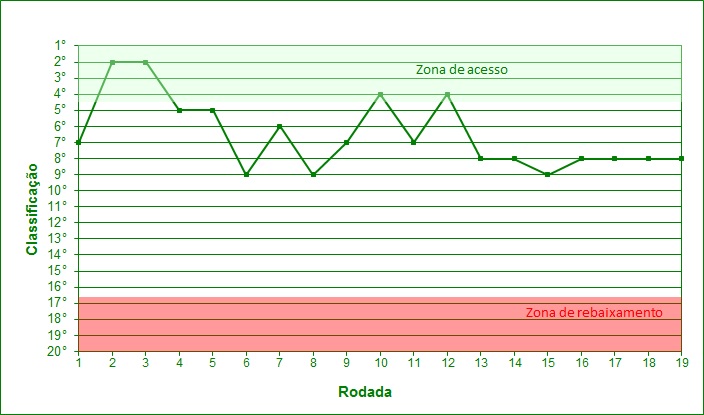 RESUMO Geral Casa Fora Jogos 19 9 10 Vitórias 10 7 3 Empates 2 0 2 Derrotas 7 2 5 Aproveitamento 56,1% 77,8% 36,7% Gols pró 20 14