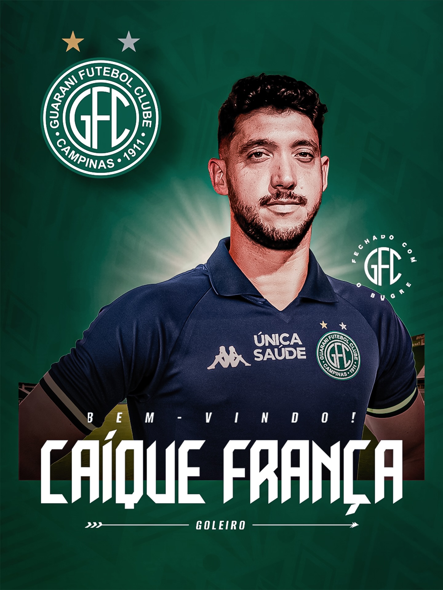 Nome completo:Caíque França Godoy Posição:Goleiro Data de nascimento:03/06/1995 Local de nascimento:São Paulo - SP Clube anterior:Sport - PE Estreia no GUARANI:10/01/2026 Duração do contrato: 31/12/2027 Estatísticas: